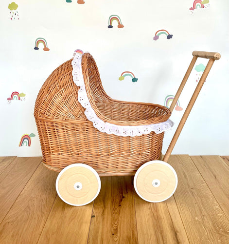 WICKER PRAM with lace trim, Doll pram, wicker doll pram with bedding included, pram toy | wooden pram, baby pram, 1st bday gift, natural