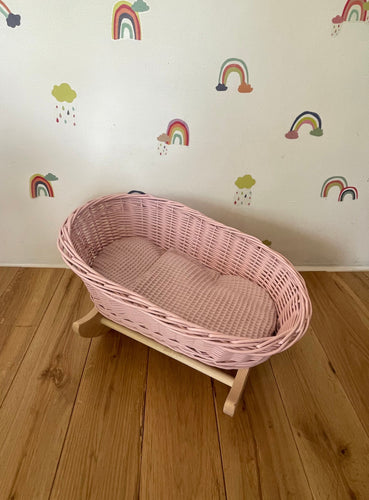 Luxury light pink doll’s cradle, wicker crib with bedding included, dolls wicker rocker, dolls cradle, doll mosses basket, bedding included