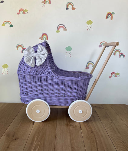 LUXURY lilac wicker pram with cream bow and matching bedding included, wicker doll pram UK, pram toy, wooden pram, 1st birthday