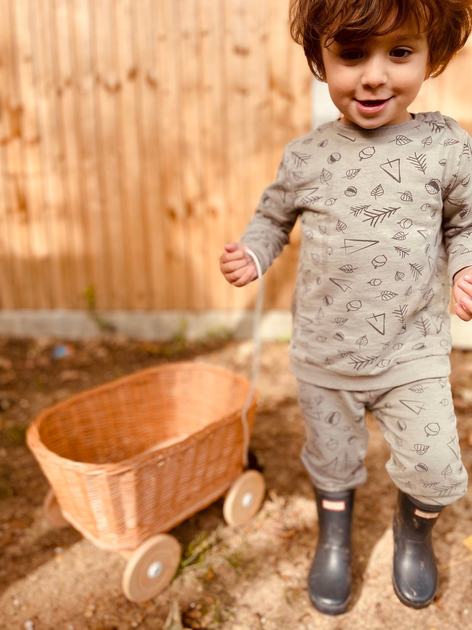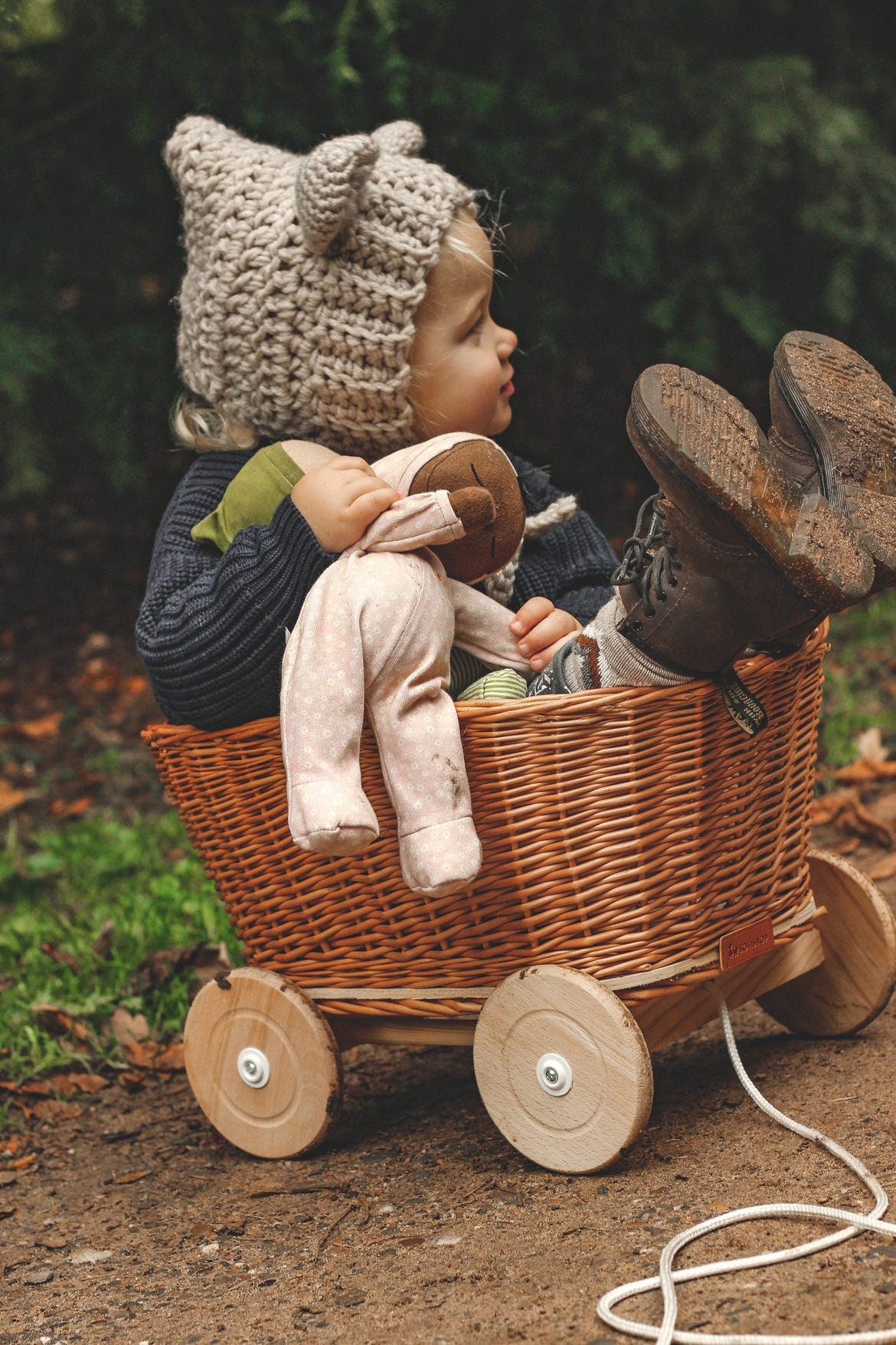 NATURAL wicker pull-along wagon toy, wagon toy with robe,