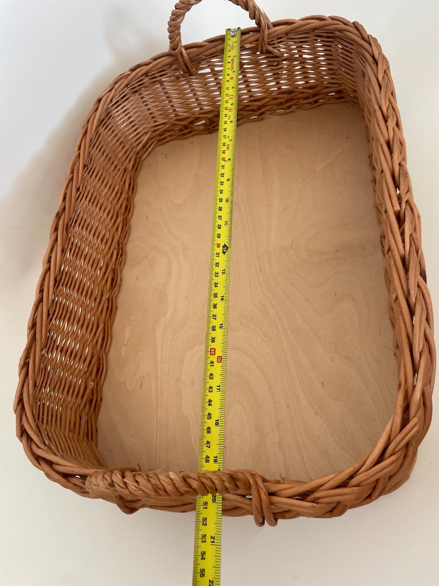 Made from natural woven wicker with wooden base, offering durability and a rustic, organic look.